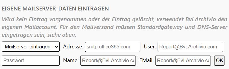 Der BvLArchivio Server verwendet einen eigenen Mailaccount für den Versand von E-Mails. Möchten Sie einen eigenen Mailaccount für den Versand von E-Mails, tragen Sie im Administrationsbereich die entsprechenden Mailserverdaten ein.