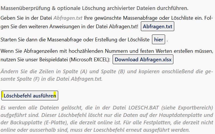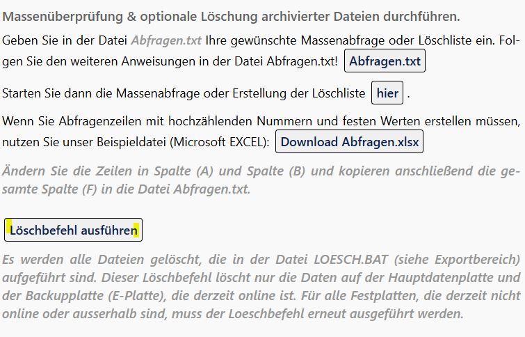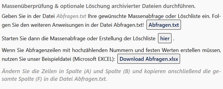 4. Klicken Sie im Administrationsbereich in der Zeile "Starten dann die Massenabfrage oder Erstellung der Löschliste" auf den Button "hier".
