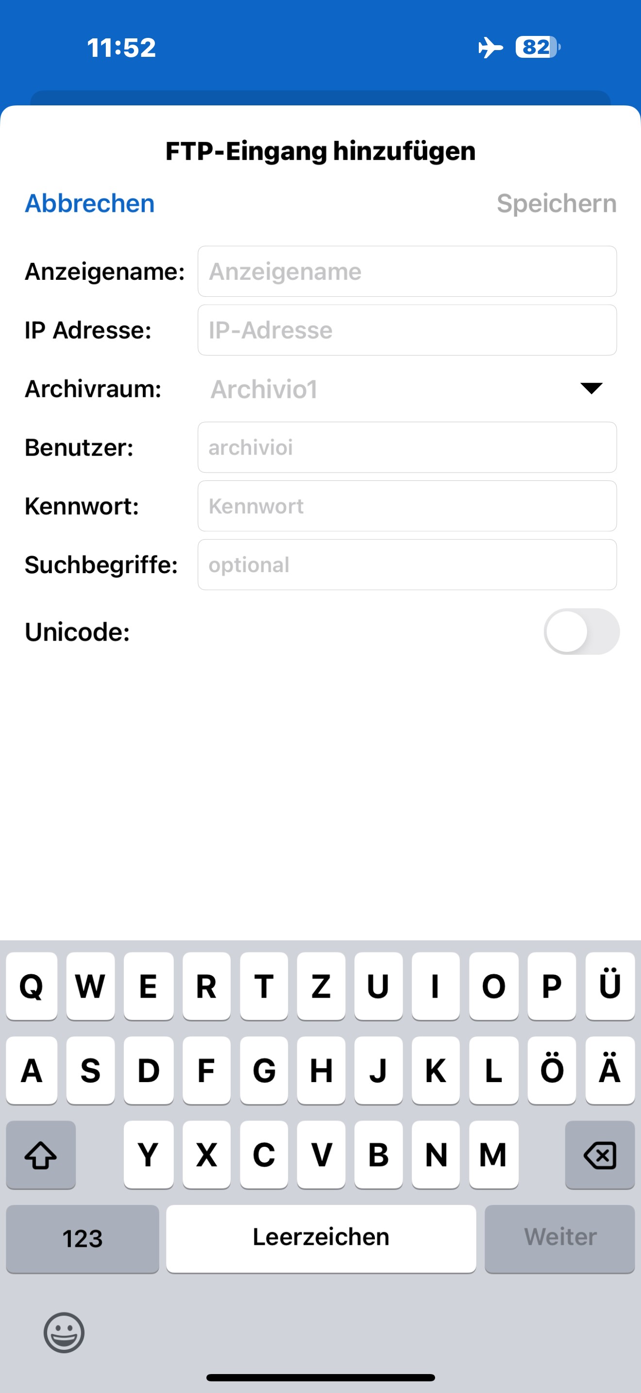 4.1. Anzeigename: Tragen Sie den Namen des Archivraumes ein (Archivio1 bis 5). Der Name wird später bei der Auswahl angezeigt und bestimmt, in welchem Archiv Sie suchen möchten.
