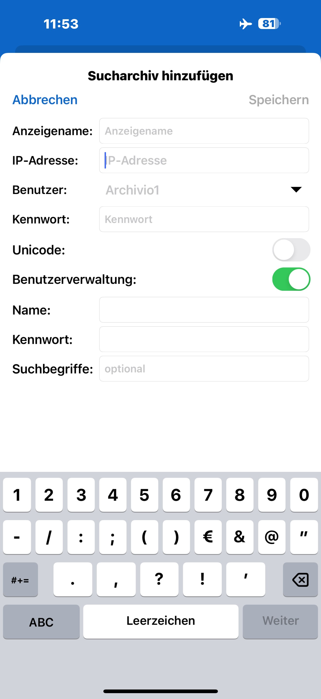 4. Für die Suche in einem Archivraum muss diese zunächst in der APP eingerichtet werden. Sie können einen oder mehrere Archivräume einrichten. Klicken Sie dazu auf + im Bereich "SUCHE". Möchten Sie im DMS suchen, verwenden Sie bitte den Browser.