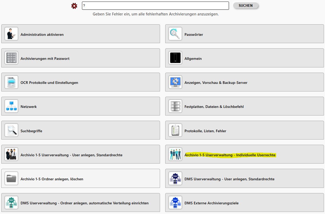 - Klicken Sie rechts auf "Archivio 1-5 Userverwaltung - Individuelle Rechte". Die Standardrechte müssen zuvor angelegt worden sein (siehe Menüpunkt davor).