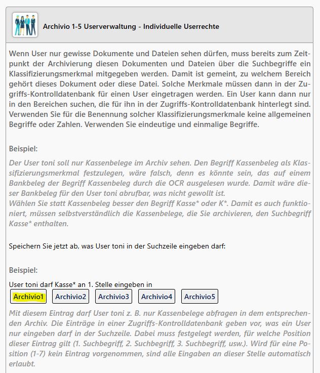 7. Jedes Archiv hat seine eigene Archivio-Kontrolldatenbank. In einer Archivio-Kontrolldatenbank sind die Rechte für einen Benutzer hinterlegt.