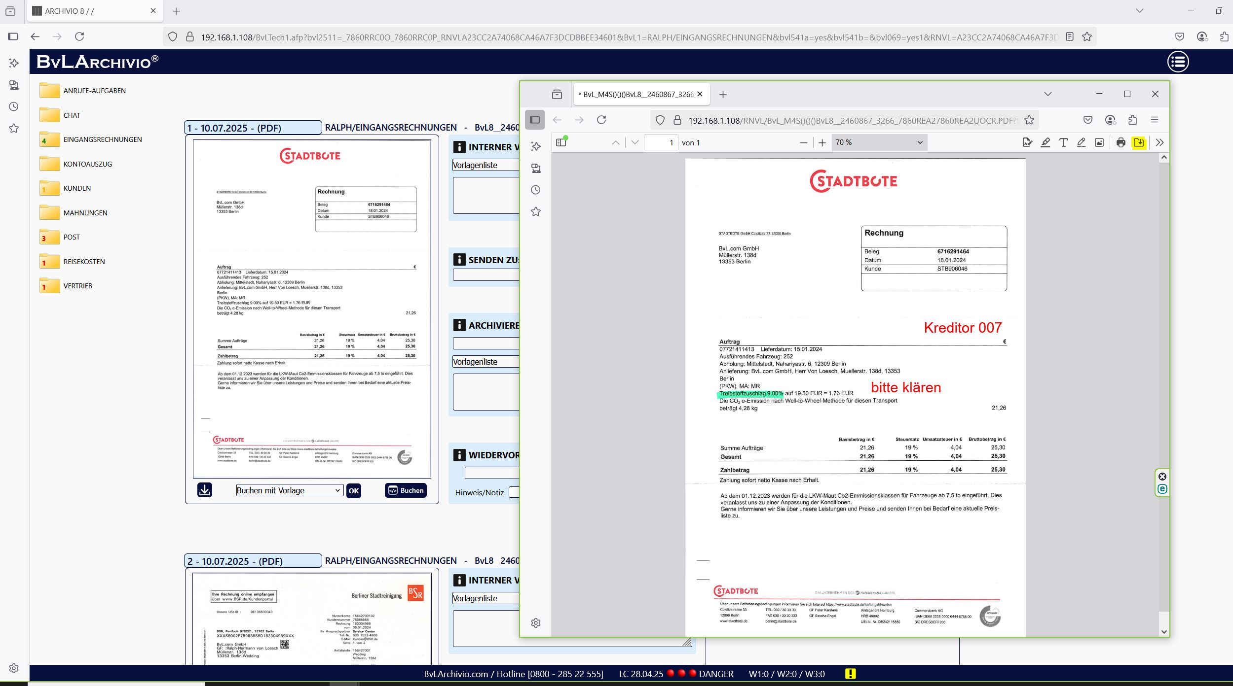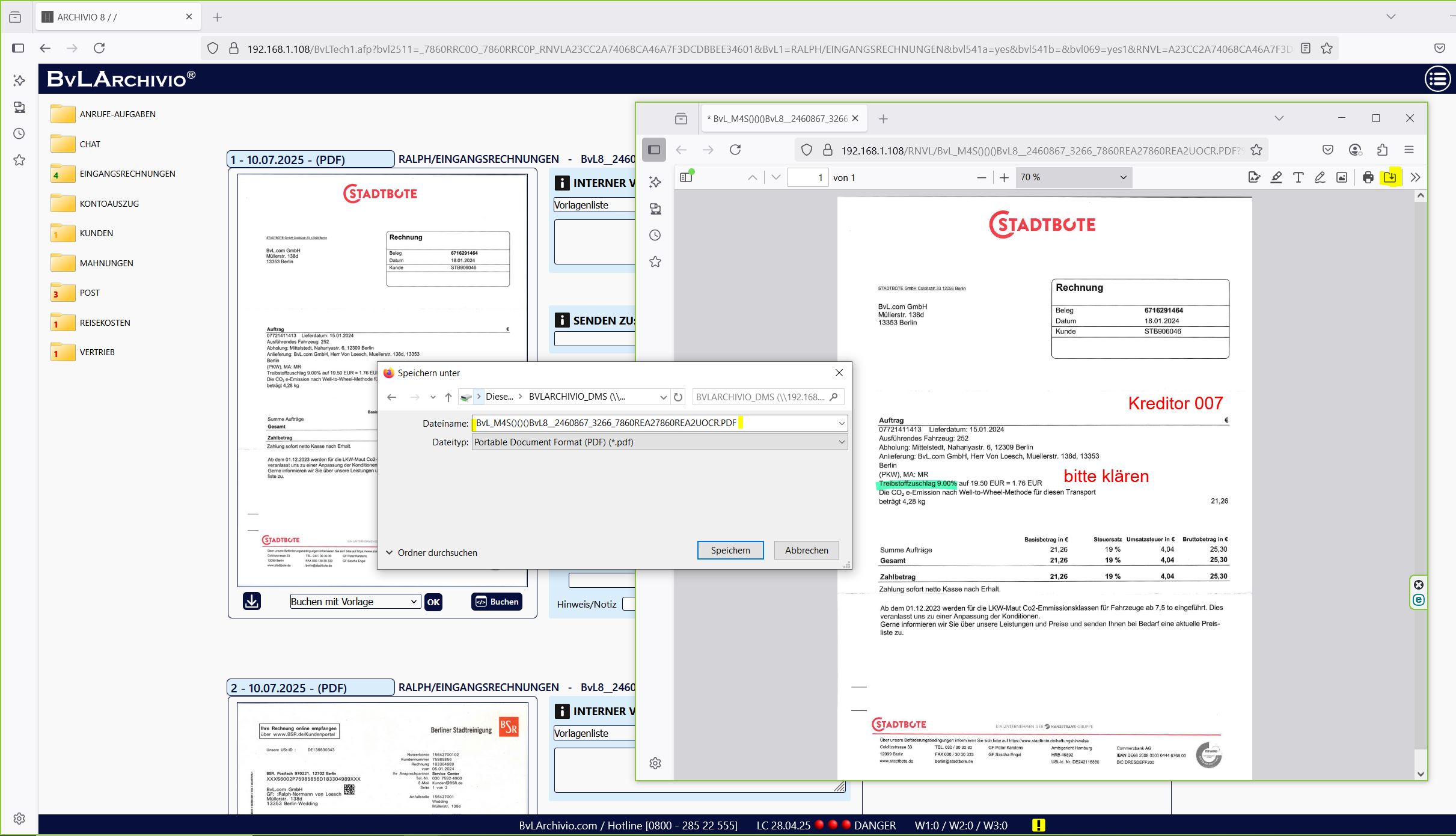 2. Speichern Sie den Vorgang nach erfolgreicher Verarbeitung auf dem zuvor eingerichteten Laufwerk \\192.168.1.106\BVLARCHIVIO_DMS (Laufwerk einrichten). Wichtig ist dabei, dass dieses Laufwerk nur für das Zurückspeichern von bearbeiteten Vorgänge zur Verfügung steht. Auch darf der Dateiname nicht geändert werden während der Speicherung, weil anhand des Dateinamens das System erkennt, wem der Vorgang nach erfolgreicher OCR (Schrifterkennung) wieder in den Ordner zurückgelegt werden muss. Beim Zurückspeichern wird immer versioniert, das bedeutet, dass die eigentliche Datei nicht überschrieben wird, sondern eine neue Version dieser Datei gespeichert wird. Auf alle vorherigenVersionen haben Sie über den Button "Versionen" Zugriff.