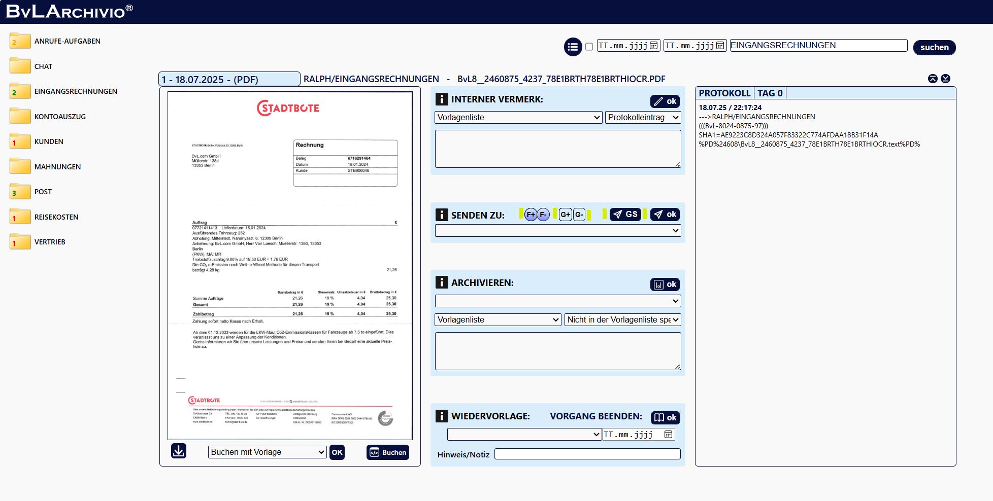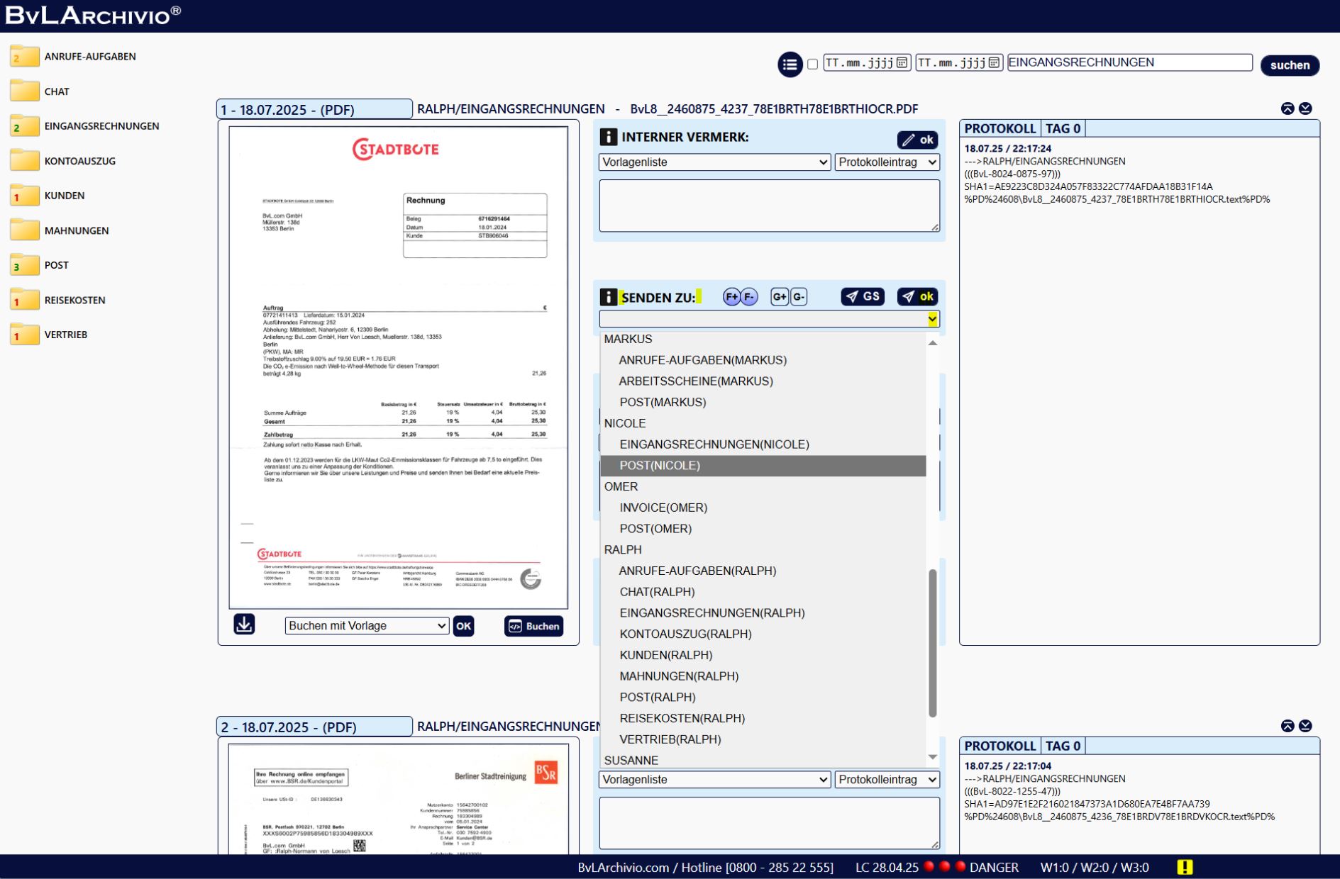 1. Klicken Sie im Bereich "Senden zu" auf den gewünschten User und seinen Ordner. Klicken Sie auf "OK". Der Vorgang mit dem gesamten Protokoll wird an den User gesendet.