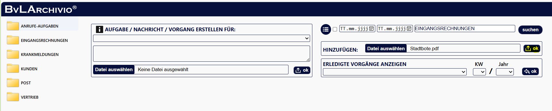 5.) Der Vorgang ist nicht sofort in dem Ordner zu sehen, da dieser nicht direkt im Ordner gespeichert wird, sondern im zentralen Eingang von BvLArchivio. Dort wird die Datei zunächst gegen Manipulation geschützt, protokolliert, der Schrifterkennung zugeführt und verschlüsselt. Alle Dateien, die ins BvLArchivio übertragen werden, durchlaufen diesen Prozess. Die Verarbeitung findet in Eingangsreihenfolgen statt. Sie sehen dementsprechend Ihren Vorgang erst in ein paar Sekunden oder vielleicht auch erst in ein paar Minuten, je nach Dateimenge, die derzeit in der Verarbeitung sich befindet. Damit Sie sehen können, wie viele Dateien derzeit in der Verarbeitung sind, schauen Sie unten auf den Verarbeitungsstatus. Die Ansicht wird aktualisiert, sobald Sie irgendwo klicken, z. B. auf den Ordner links.