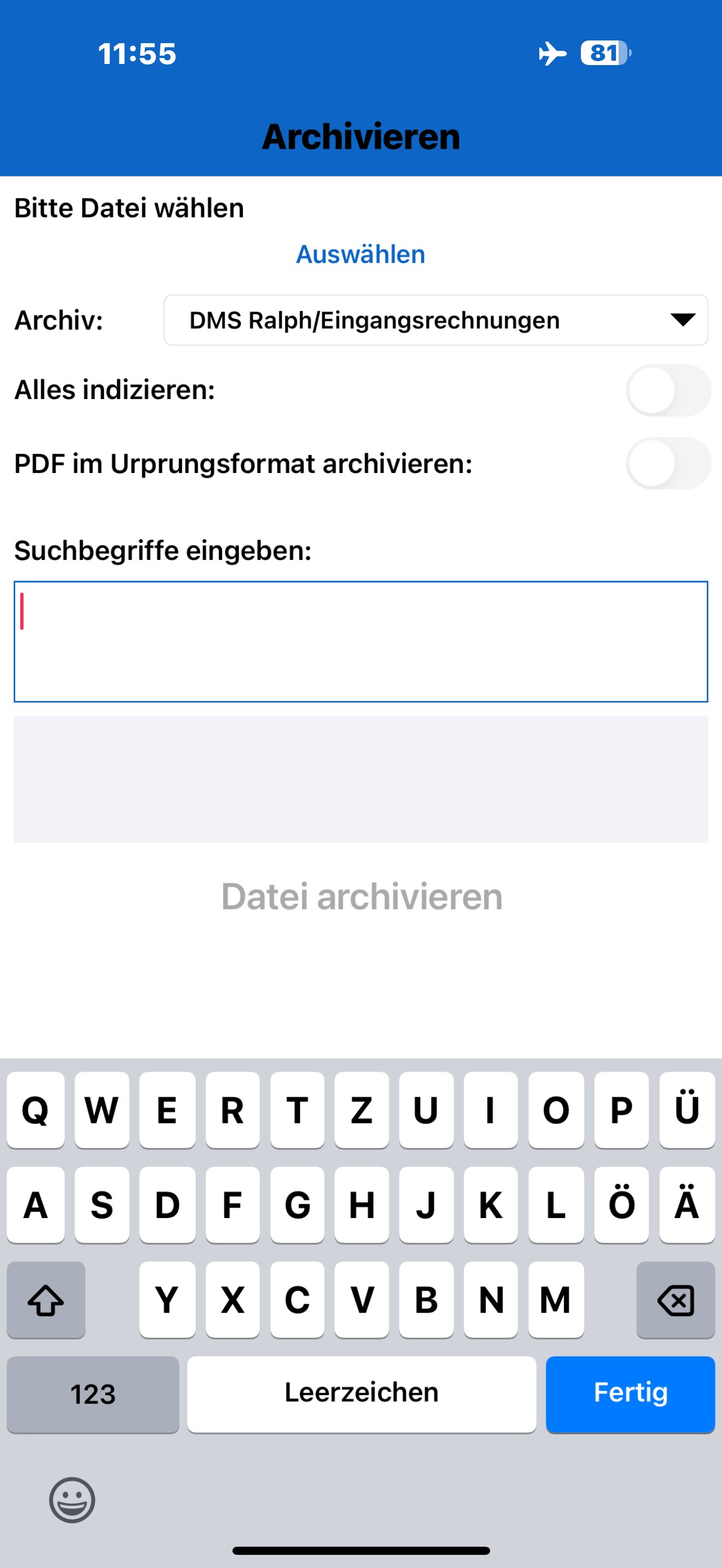 8. Suchbegriffe: Tragen Sie alle Suchbegriffe oder Ordnernamen ein, nach denen die Datei abgelegt bzw. wiedergefunden werden soll.