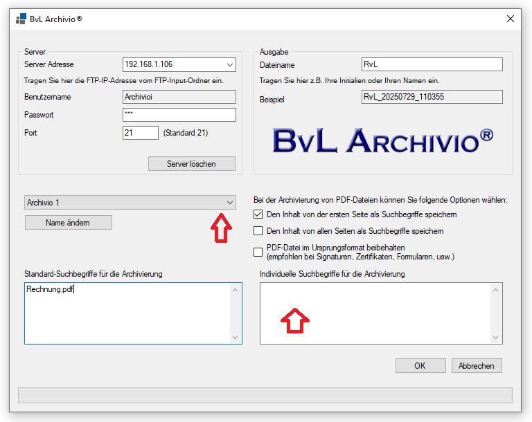3. Tragen Sie im Feld "Indiv. Suchbegriffe" Ihre Suchbegriffe, Ordnernamen, Kategorien, usw. ein, nach denen die Datei archiviert und auch wiedergefunden werden soll.